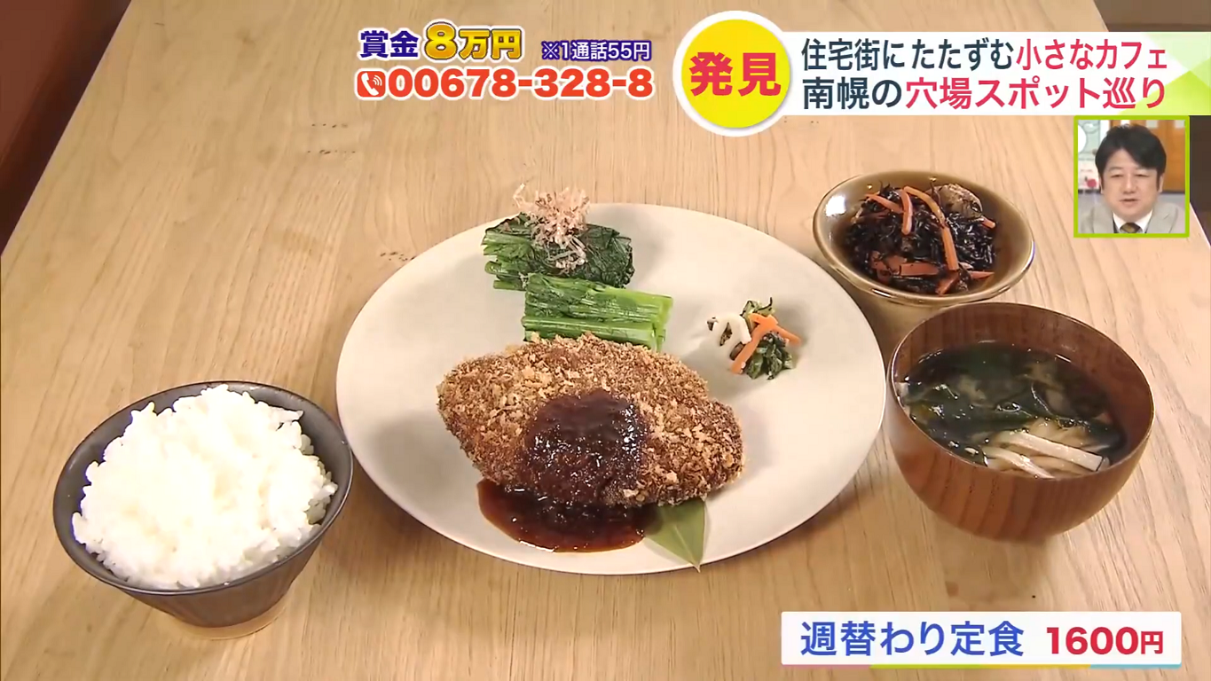 遠藤リポーターがが週替わり定食(1600円)をいただきます。粗めのパン粉をまとってカラリと揚がったメンチカツは、サクサクとした音もおいしいです。