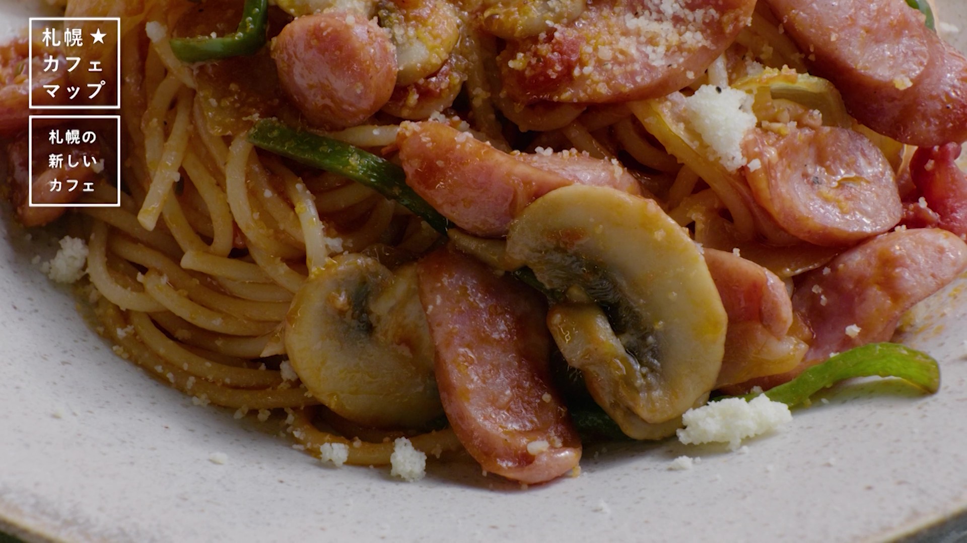 ウインナーやとても大きなマッシュルーム、タマネギ、ピーマンなどシンプルな具材がたっぷり。それぞれの具材のうま味が麺にしっかり絡んでいます。
