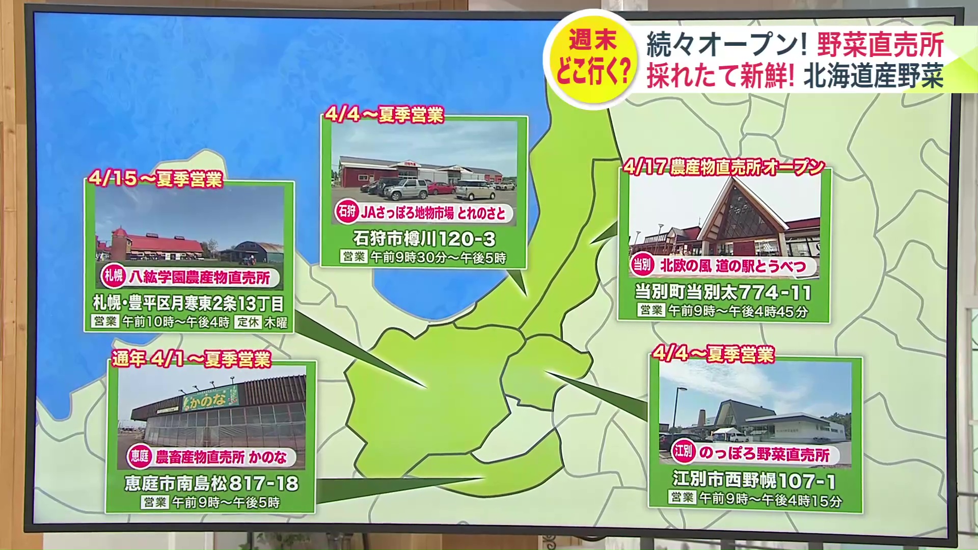 恵庭市の「農畜産物直売所 かのな」石狩市の「JAさっぽろ地物市場 とれのさと」、江別市の「のっぽろ野菜直売所」などは4月1日からすでに夏季営業を始めています。