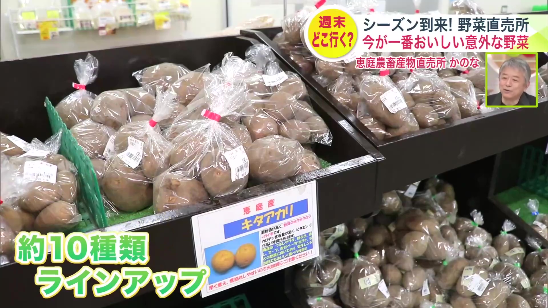 「かのな」では、これからの時期バーベキューやじゃがバターにぴったりな「キタアカリ」や煮物やカレーに合う「はるか」など、約10種類の品種が並んでいます。