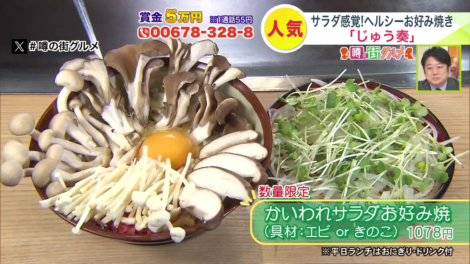 数量限定「かいわれサラダお好み焼き(具材:エビ・きのこ) 1,078円(税込)」は、かいわれがたっぷりのったヘルシーな一品。