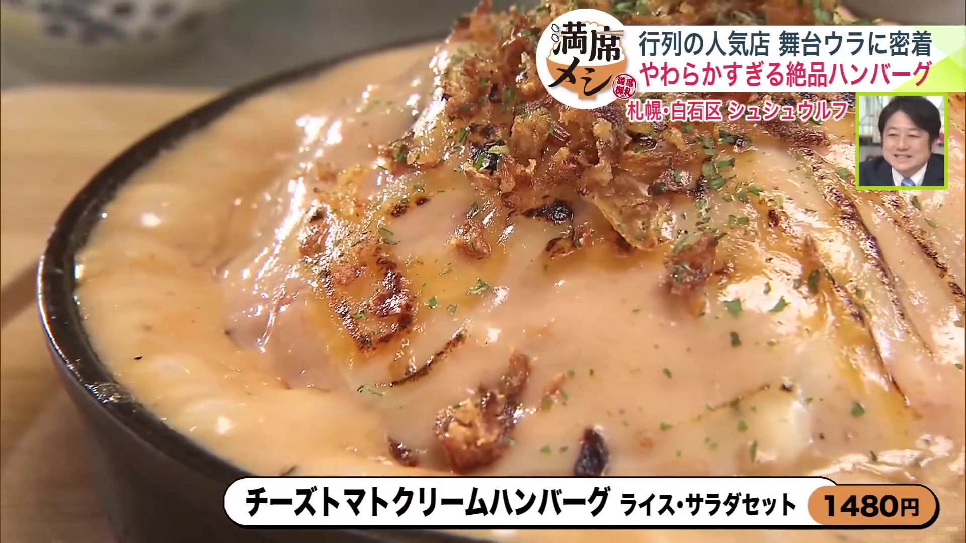 シュシュウルフの定番メニューは、「炙りチーズのオニオンソースハンバーグ ライス・サラダセット 1,480円(税込)」です。