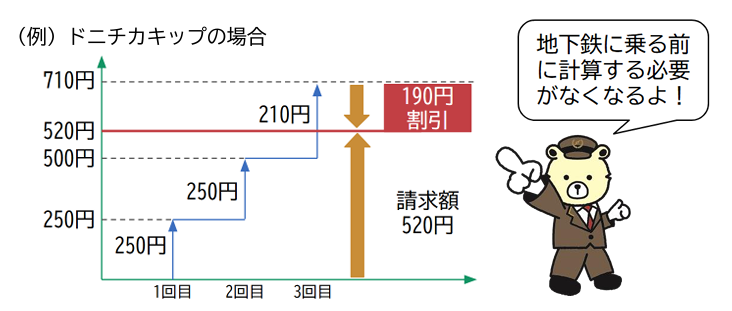 たとえば土日のお買い物や観光で地下鉄を何度も乗り降りする場合、520円を超えた時点でそれ以降は無料に!