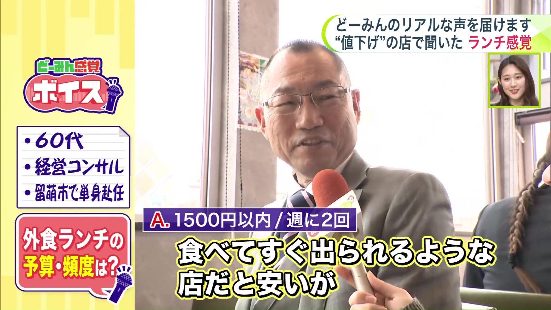 60代、経営コンサルの男性は、「食べてすぐ出られるような店だと安いが、食べて少しゆっくりしたい時は1000円以上になります」とのこと。