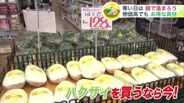 すっかり寒くなりましたね~。体の中から温まる鍋料理が恋しい季節。物価高騰が続く中、今が買い時のお得な具材を探してきました。長ネギ5本で138円、ハクサイ半玉128円…。お得な食材で今夜はお鍋に決まりですね!