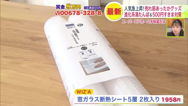 「窓ガラス断熱シート5層 2枚入 1958円」は窓に貼る断熱シート。汚れをふいて霧吹きなどで窓に水をかけて貼るタイプです。