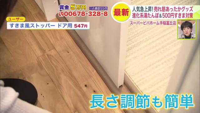 「すきま風ストッパー ドア用 547円」は、ドアの長さに合わせてストッパーをカットし、間に差し込むだけで廊下の寒い空気をガードしてくれます。