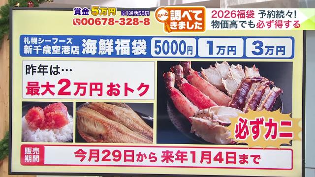 例年、明太子やホッケなどが入っていて、昨年は最大2万円お得でした。さらに、すべての福袋に必ずカニが入っているんですって。