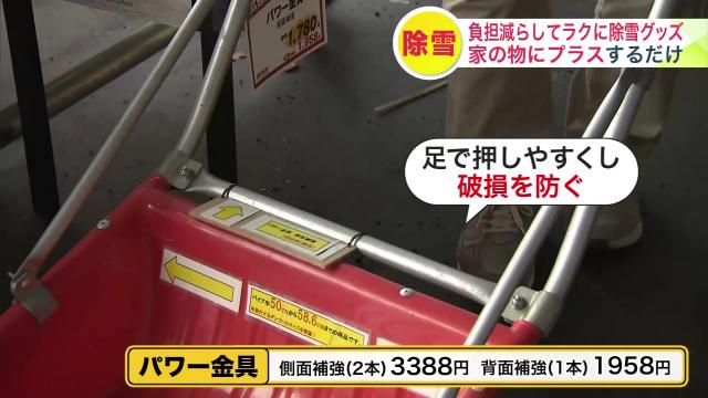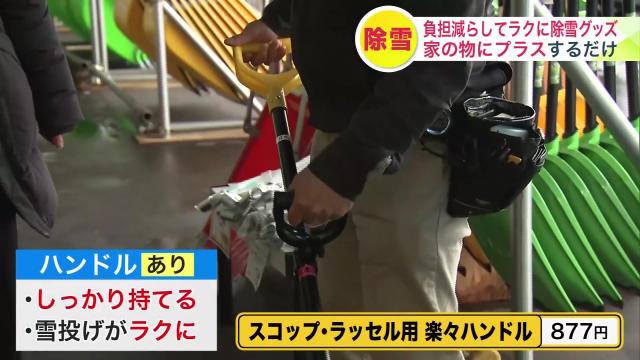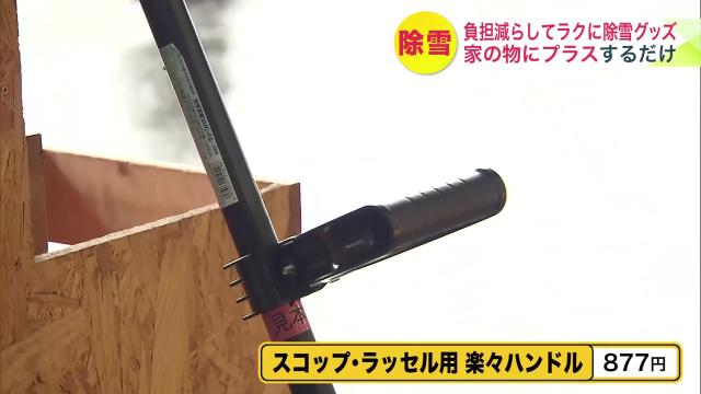 『スコップ・ラッセル用 楽々ハンドル 877円(税込)』は、既存のスコップやラッセルに取り付けることで、除雪の補助ができるというアイテム。