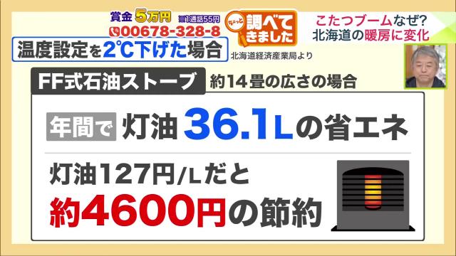 北海道経済産業局の試算では、部屋の温度設定を2℃下げるだけで、年間で灯油36.1リットル、約4600円の節約に。