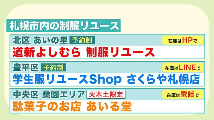 紹介した北区のお店のほかにも、札幌市内には制服のリユース店があります。