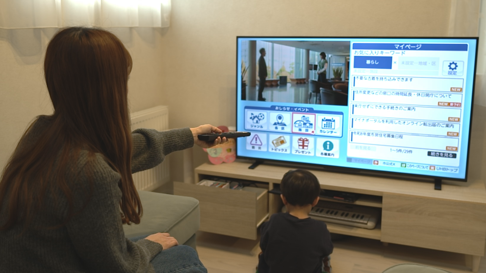テレビのリモコンにある「dボタン」を押すだけで『札幌市からのおしらせ』がチェックできるので、仕事や子育てで忙しくても便利で簡単。