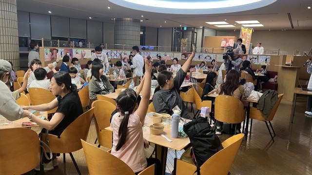 兄弟・姉妹での参加者が目立ち、席で待つ間もリラックスした様子。司会のアナウンサーが質問をすると元気に声を出し、会場は一気に賑やかになりました。
