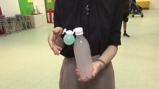 消毒液を入れたペットボトルに空気をドンドン入れて、ふたを開けると…。