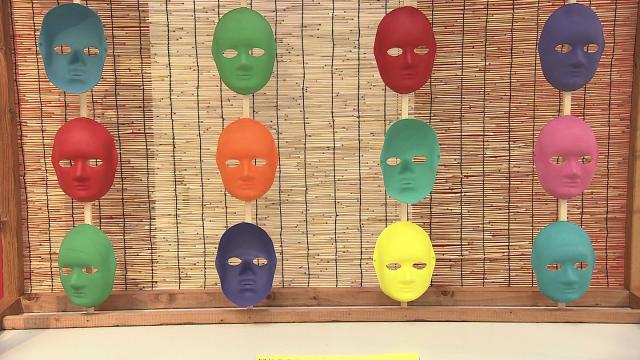 「錯視お面」という展示は、16個のお面のうち、いくつかがウラになって飾られています。