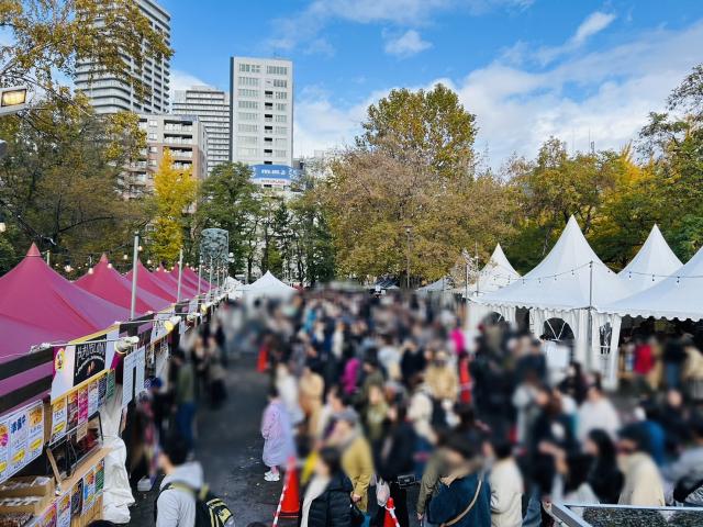 会場は紅葉の名所として知られる中島公園・南9条広場。金色に輝くイチョウ並木の中で、ここでしか体験できない秋の味覚と賑わいを楽しめます。