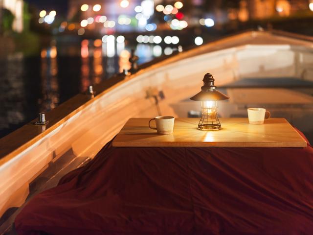 通常の運河クルーズはベンチ席ですが、このプログラムではこたつを設置した専用船を運行。