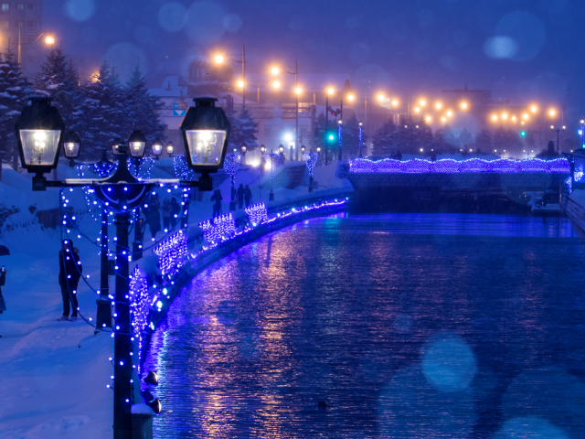 青色のイルミネーションが水面に映り込み、通り沿いの建物とともに幻想的な雰囲気をつくり出す人気のイベント。