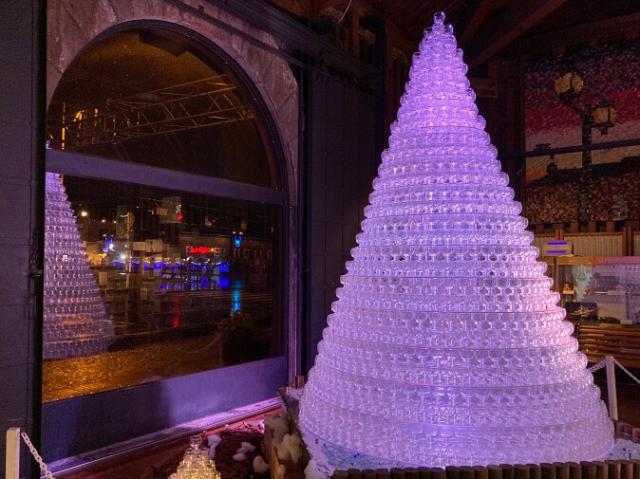 約2000個のワイングラスを積み重ねた光のオブジェで、冬の街を彩る季節限定の装飾です。
