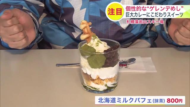 「北海道ミルクパフェ(抹茶)800円」は、ソフトクリームや抹茶のわらびもち、あんこなどが何層にもなっていて、上には抹茶がかかっています。