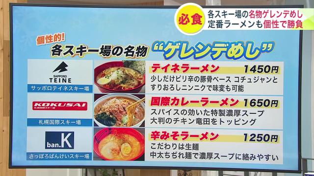 サッポロテイネスキー場はピリ辛豚骨ベースの「テイネラーメン 1450円」、札幌国際スキー場はスパイスのきいた「国際カレーラーメン 1650円」、さっぽろばんけいスキー場は、中太ちぢれ麺で濃厚な「辛みそラーメン 1250円」など、各スキー場によって個性豊かです。