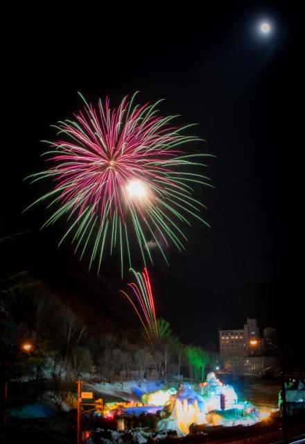 氷瀑まつり開催期間中には、毎晩午後8時30分より、氷像の裏手から花火が打ち上げられます。