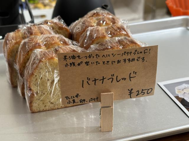 お店のおすすめは「バナナブレッド 250円(税込)」。バターの代わりに米油を使用したパウンドケーキで、小腹がすいたタイミングでつまみやすいサイズ感もうれしいポイントです。
