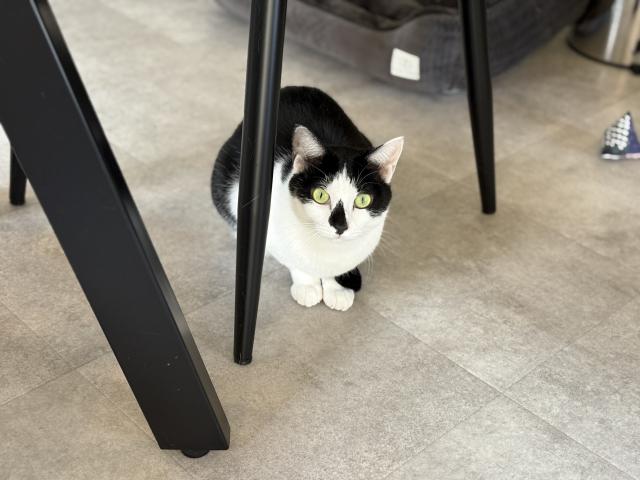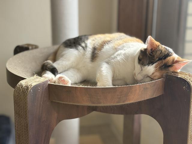 三毛猫のりりちゃんは警戒心が強い一面もありますが、好奇心が旺盛なタイプ。荷物の匂いをチェックしに、近くまで寄ってきてくれることもあります。