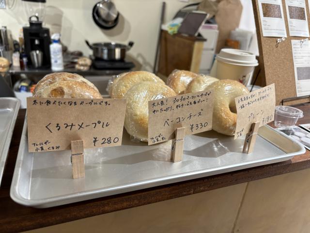 スペシャルティコーヒーや日替わりのベーグルなど、カフェメニューにもこだわりが。注文を受けてから作るベーグルサンドは、常時2種類が用意されています。