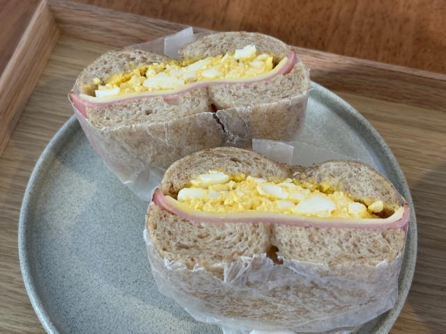 今回は、ベーグルサンドの一番人気「ハムチーズたまごサンド 600円(税込)」を注文しました。王道の組み合わせのベーグルサンドは、作業の合間の軽いお食事としてもおすすめです。