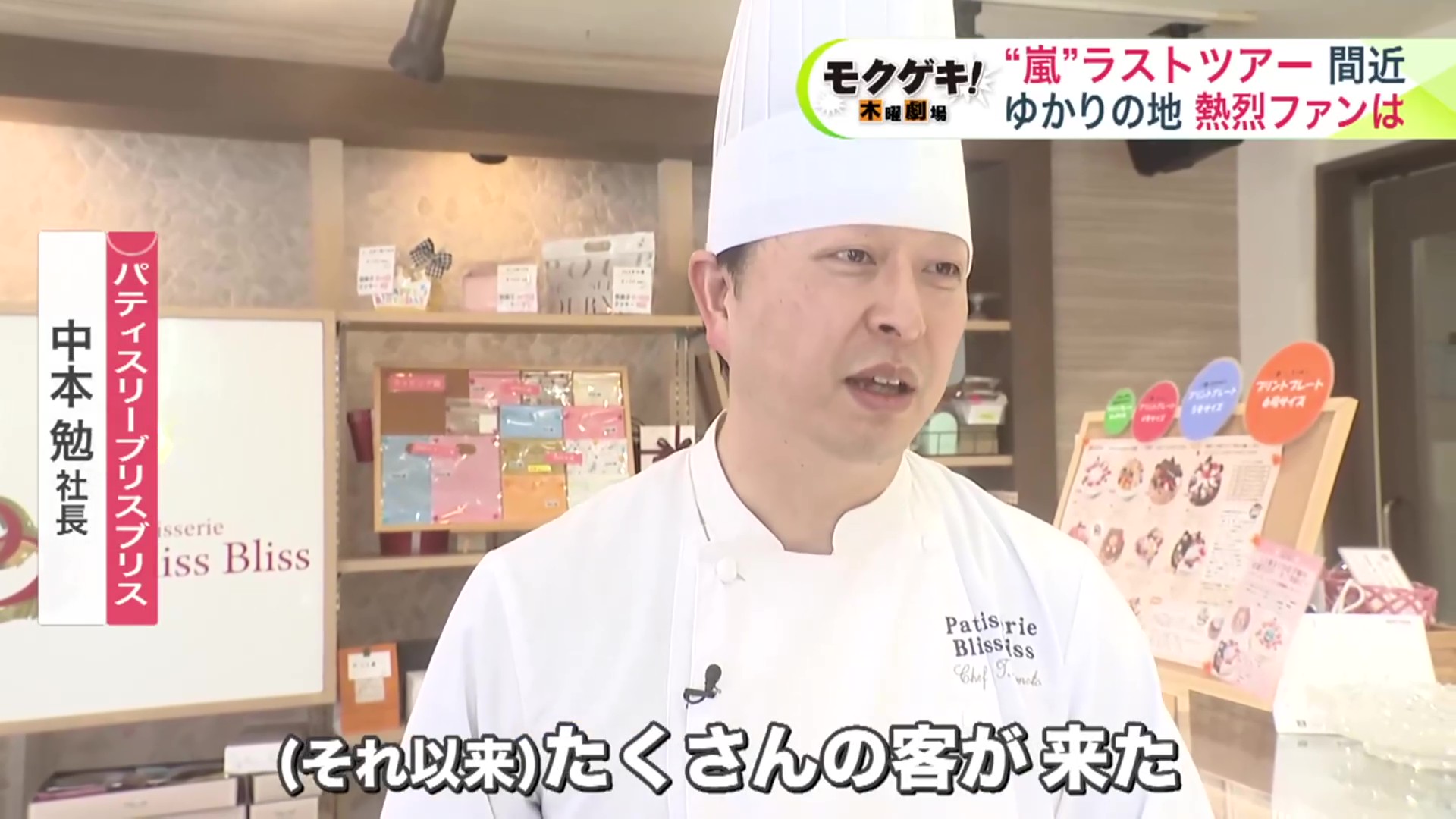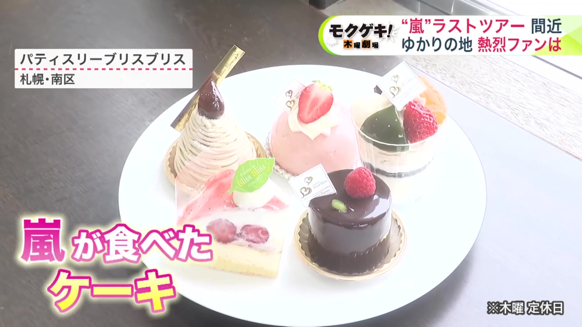 札幌市南区の洋菓子店「パティスリー ブリス ブリス」には、2018年のコンサートの際に関係者がケーキを差し入れ、嵐が食べたというケーキが並びます。