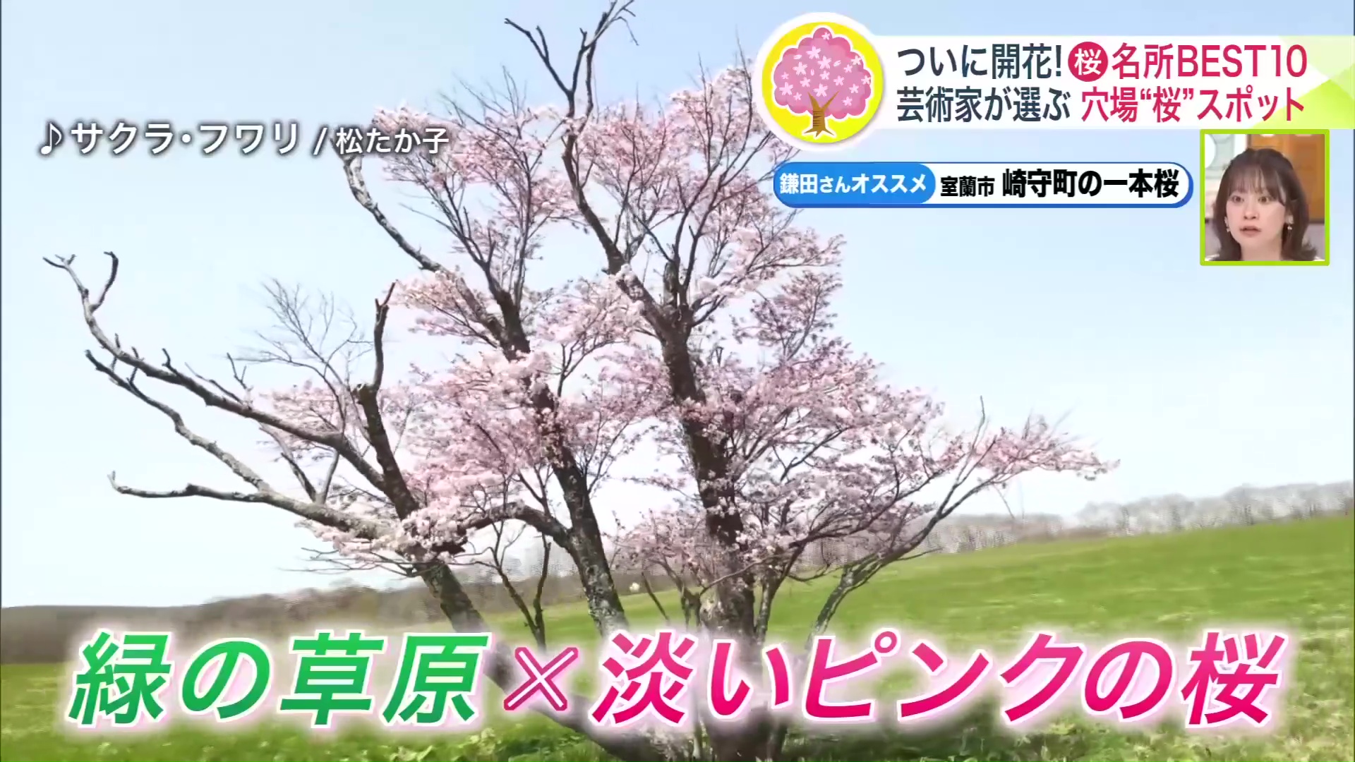 草原の緑と桜の淡いピンクが素晴らしい光景で、今では全国から写真家が集まる絶景スポットに。