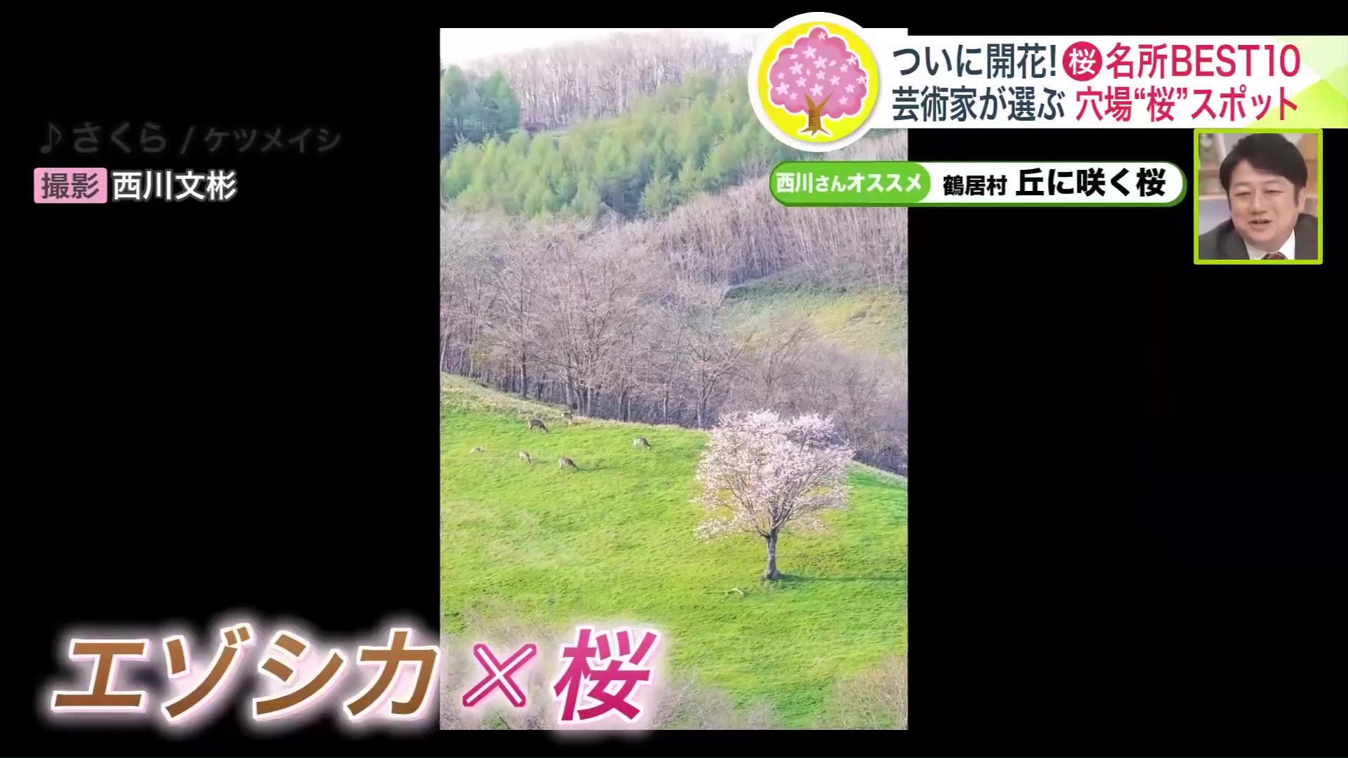 丘陵地帯に、1本の桜が咲いていて、丘と木の繋がりがすごく絵になる。待っているとエゾシカが出てくる」と西川さん。